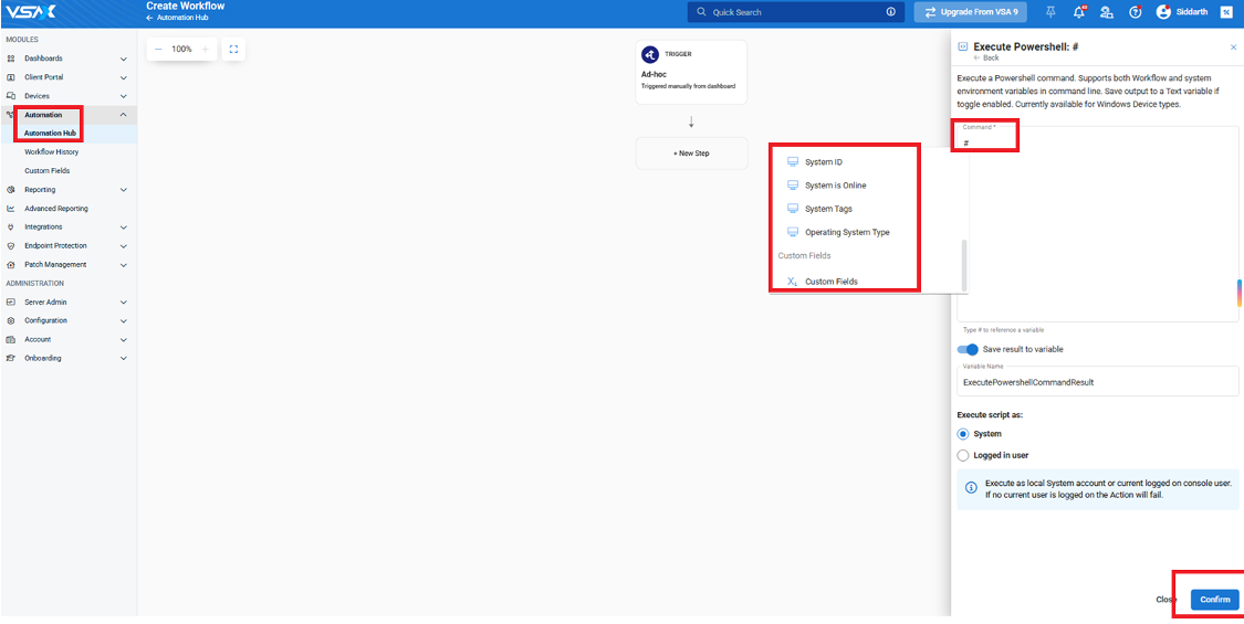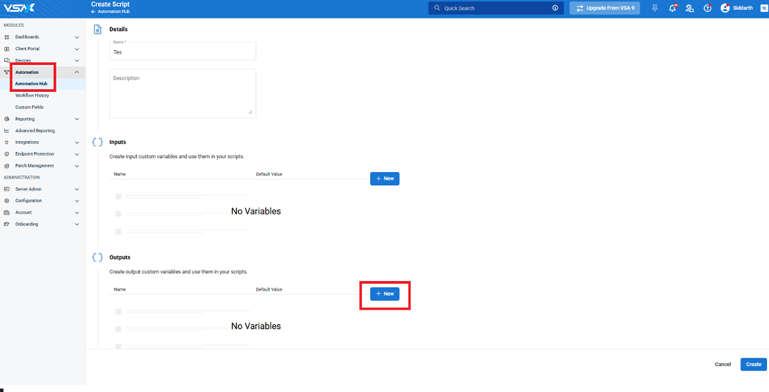 In VSA 10, variables are managed directly within the Automation Hub and inside scripts or workflows. There is no separate Variable Manager as in previous versions.