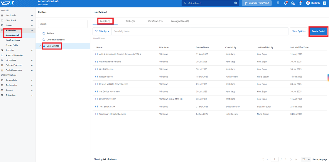 - In the Automation Hub, click the Scripts or Workflows tab.