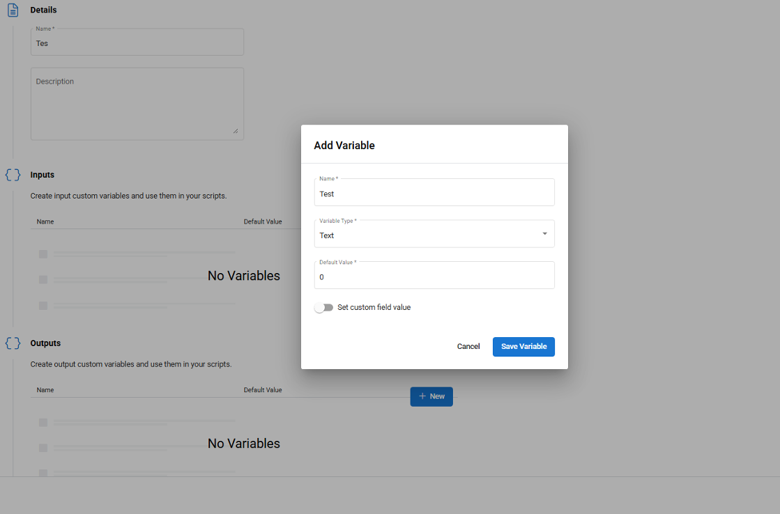 - You can create or edit variables while configuring actions in the workflow or script editor.