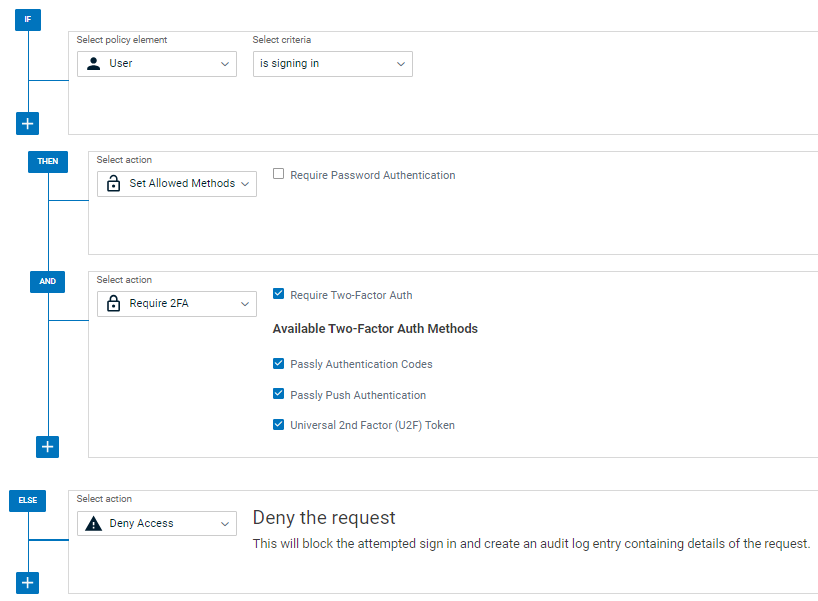 This policy requires the user to provide second factor authentication. The supported second factor authentication types are listed in the ‘Require 2FA’ Section of the Policy.