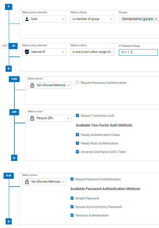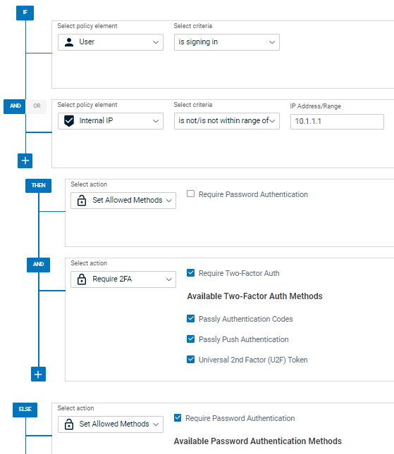 This policy adds an ‘Internal IP‘ restriction. In this case, if Internal IP is 10.1.1.1 then user won't be prompted to use 2FA, otherwise 2FA is required.