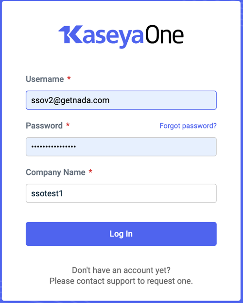 2. Enter your KaseyaOne credentials. They must belong to the KaseyaOne company that is mapped to your VSA organization.