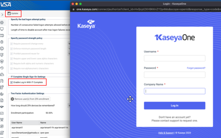 3. Check the Enable Log In With IT Complete button and click Update. A new window with a KaseyaOne login page will open.