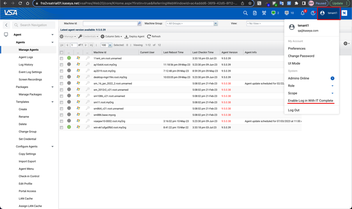 To register individual VSA user accounts with KaseyaOne accounts, each user within the mapped organization(s) can use the VSA login page or their user menu to enable Login with IT Complete.