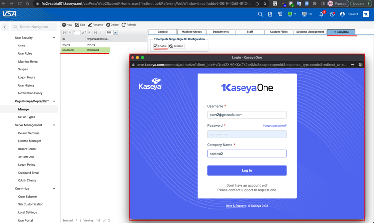 2. Click the Enable Log In With IT Complete option. A new window with KaseyaOne login page will open.